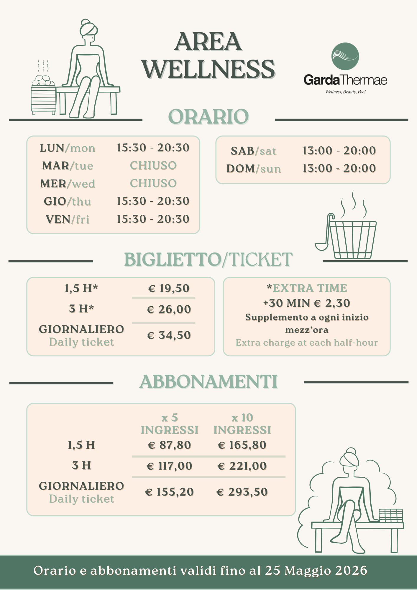 - partecipazione alle diverse attività che si svolgono nell'AREA WELLNESS (Aufguss, Peeling, etc.);