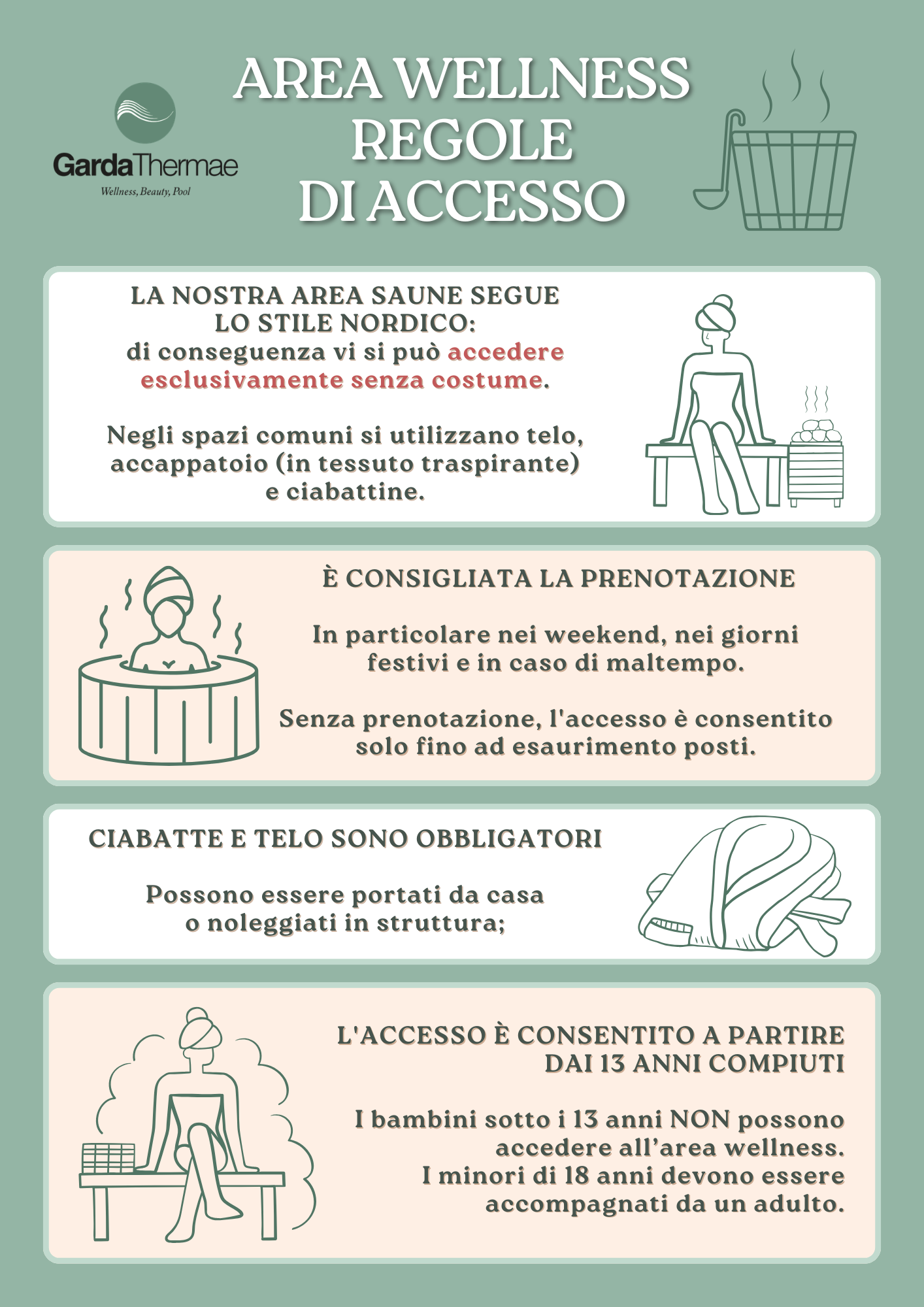 L'accesso all'AREA WELLNESS è consentito solo agli adulti o ai minori accompagnati a partire dai 13 anni compiuti.